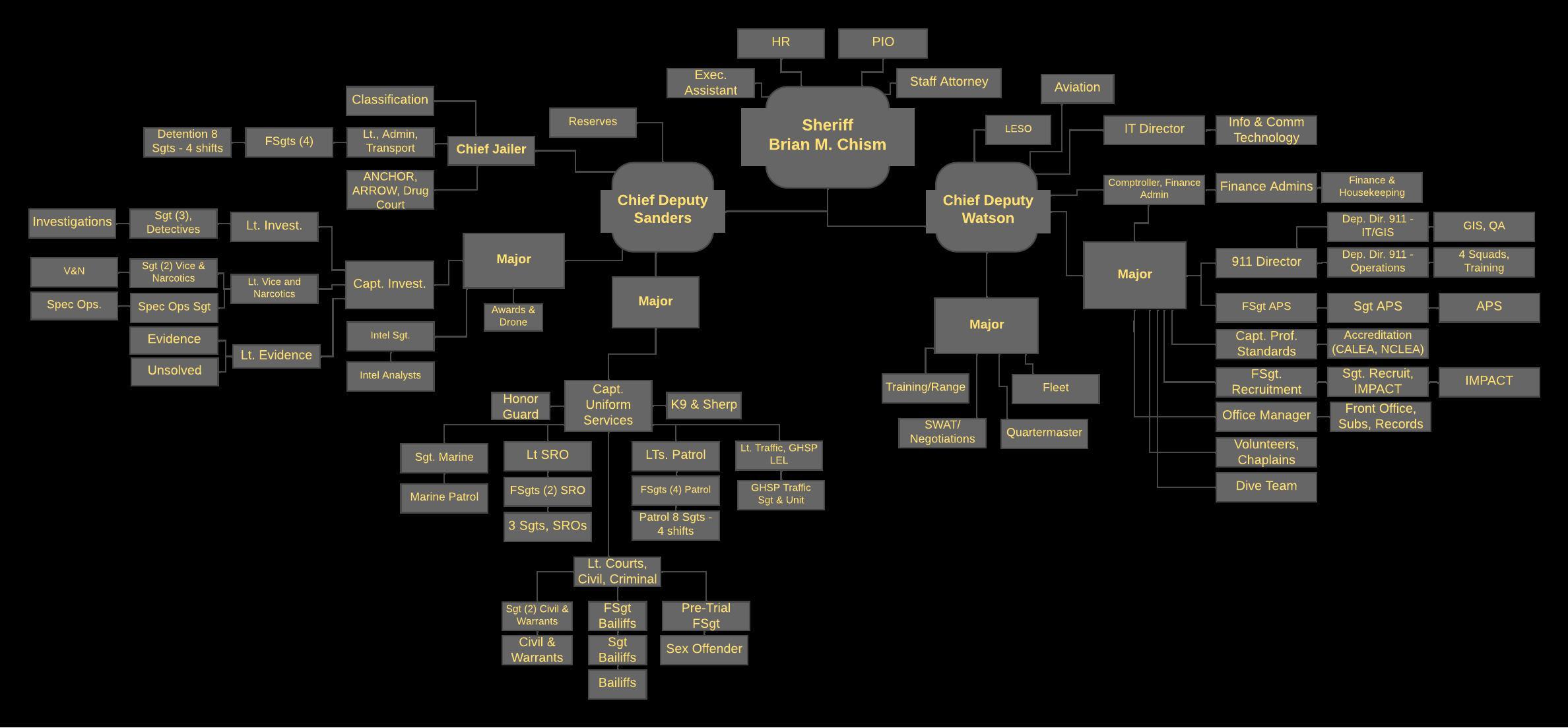 The Brunswick County Sheriff’s Office has 250 sworn and professional staff members and over 100 volunteer personnel. The office is made up of several specialized divisions which are tasked with specific duties to help fulfill the mission of keeping the citizens of Brunswick County safe and secure. There are currently 28 different divisions, units and teams that comprise the Sheriff’s Office. Images displayed below can be clicked to view additional information about each division, and our organizational chart can be viewed online at any time.